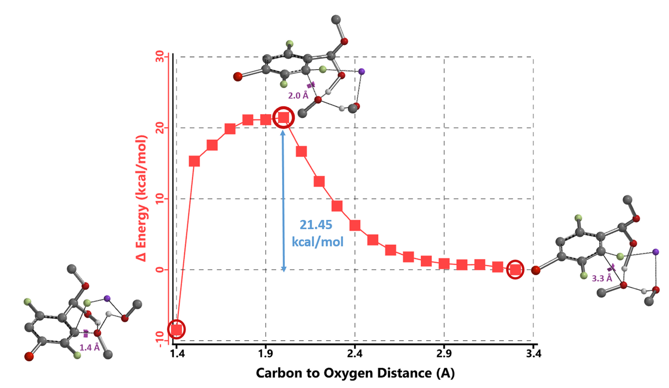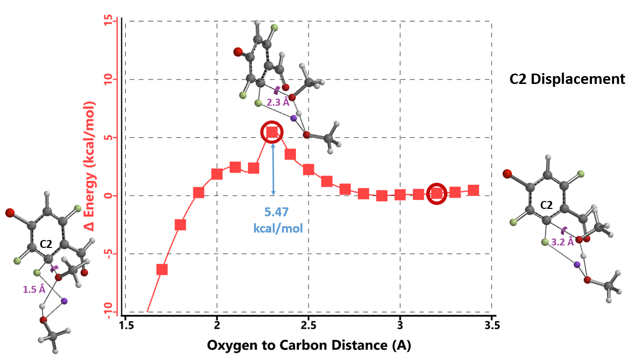 总结一下,QM 计算2,3,6-三氟-4-溴苯甲醛和甲醇钠之间的 SNAr 反应是通过其相应的半缩醛产物进行的,溶剂甲醇分子是反应过渡态中不可或缺的组成部分。 一分子和两分子甲醇反应模型都可以解释 C2 优先发生反应的原因。使用两分子甲醇模型计算得到的反应活化能为 21.45 kcal/mol,与实验条件更吻合。