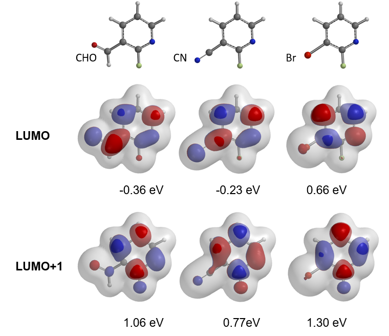 对于图 8 中的2-氟吡啶类的 SNAr 反应,间位有吸电子基团的(例如含CHO、CN 等)被认为会增加C-F碳的亲电性,从而加速SNAr反应。但在实践中,它们的反应活性非常低,不到5%的转化率。而当R为溴时,底物却很容易与仲胺发生SNAr,收率高达80%。根据LUMO、LUMO+1 及其与电子密度图的叠加图,您能给出合理的解释吗?